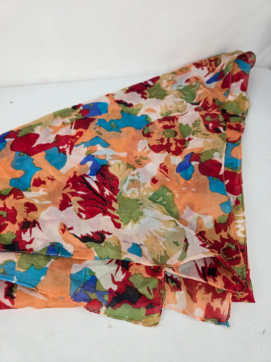 Vintage Silk Blue & Orange Flower Print Square Scarf