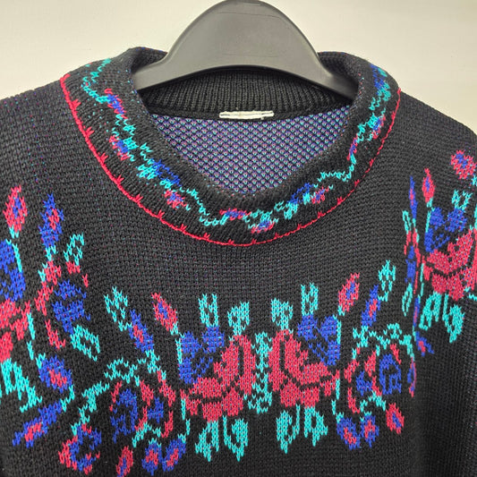 Vintage Black Floral Knit Tunic Sweater Size M/L