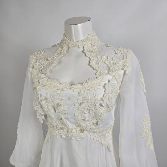 Vintage 1970s Boho White Lace Wedding Gown Size S