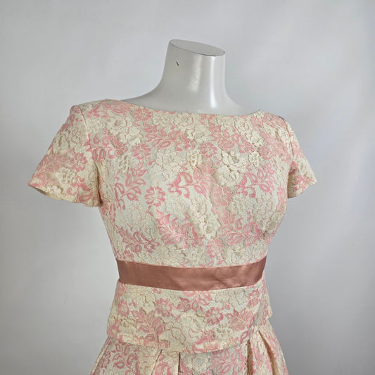 Vintage 60s Pink Floral Lace Long Gown Dress Size S