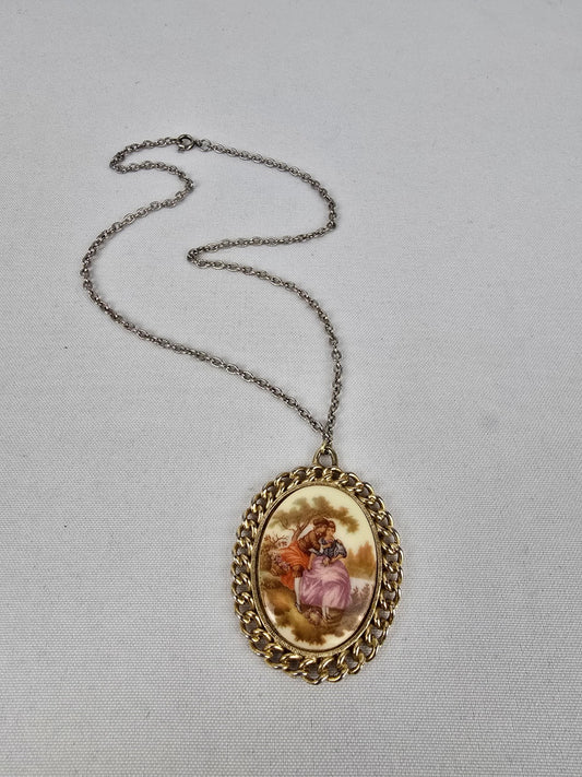 Vintage Porcelain Romantic Couple Cameo Gold Tone Pendant Necklace