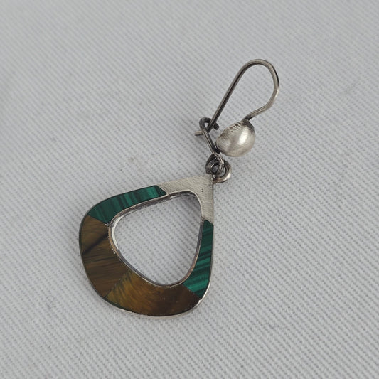 Vintage Taxco 925 Sterling Silver Dangle Earrings Mexico Tiger Eye Malachite Inlay