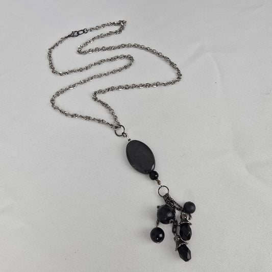 Silver Tone Black Glass Tassel Pendant Long Necklace