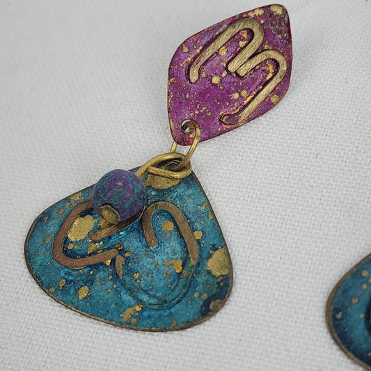 Vintage 80s Purple & Blue Metal Drop Earrings