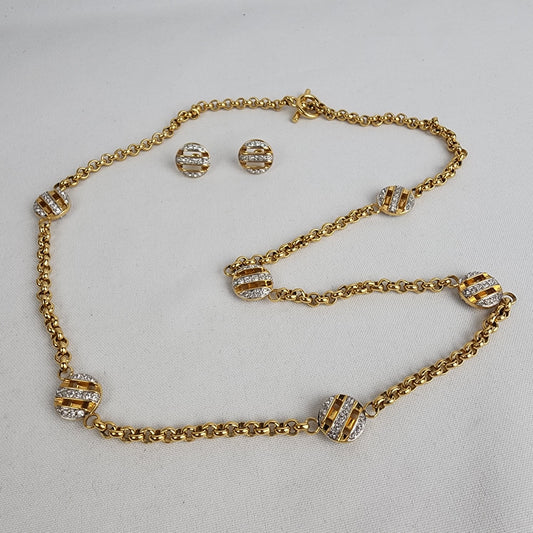 Vintage 80s Gold Tone Chain Crystal Long Necklace & Earring Set