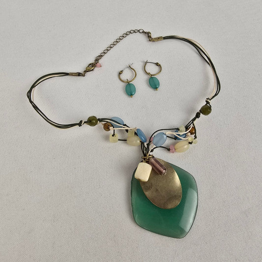 Vintage Avon Green Pendant Beaded Necklace & Earring Set