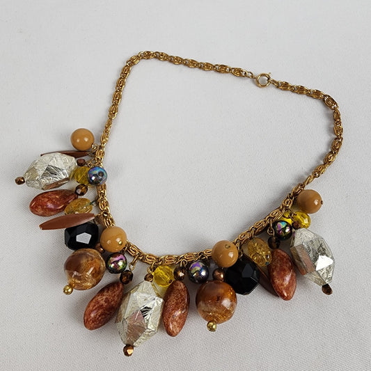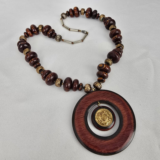 Vintage Brown Wood Oversize Pendant Beaded Long Necklace