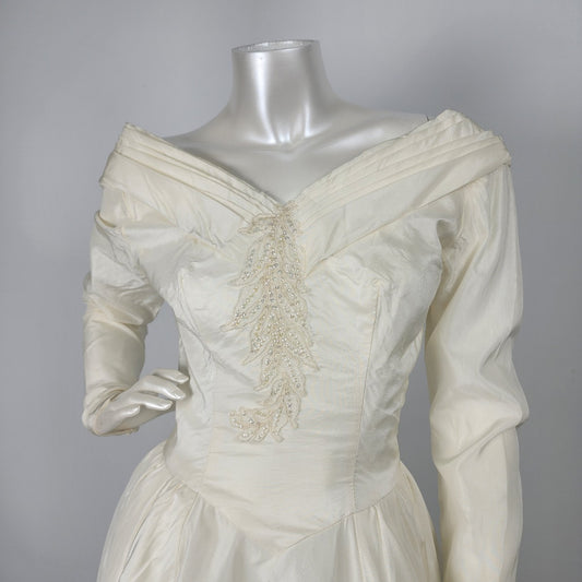 Vintage Cream Sequined Floral Detail Drop Shoulder Wedding Dress Size XS/S