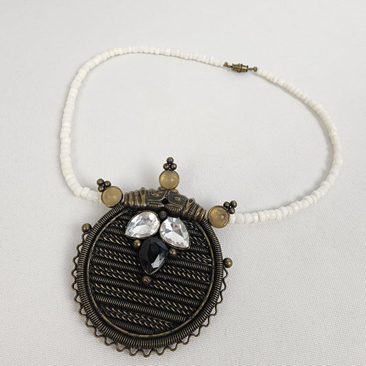 Vintage White Beaded Bronze Oversize Pendant Necklace