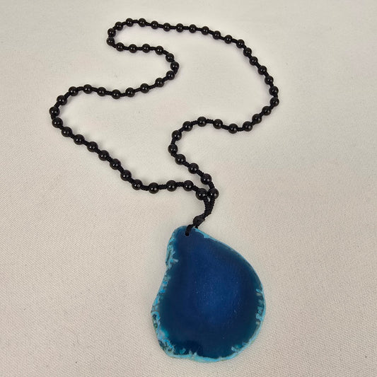 Blue Agate Geode Pendant Black Beaded Long Necklace