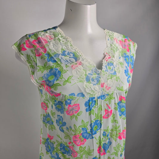 Vintage Blue Floral Lace Trim Lingerie Night Gown Slip Dress Size M