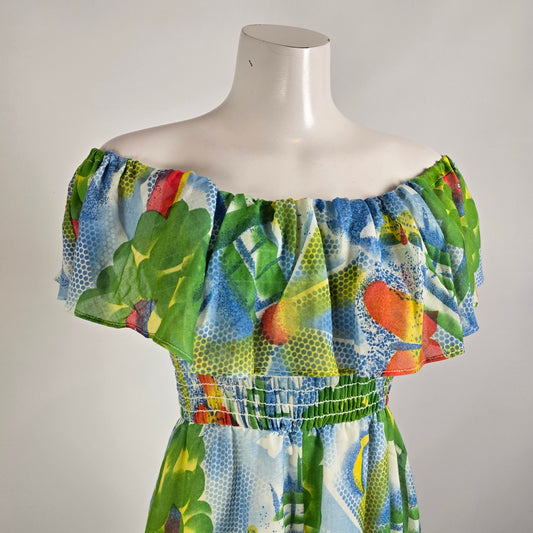 Vintage Pantel Tropical Floral Off Shoulder Maxi Dress Size 11