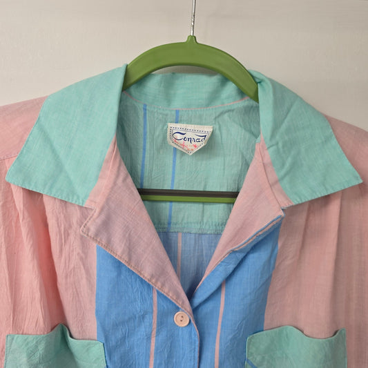 Vintage Pink Pastel Color Block Button Up Long Tunic Top Size M