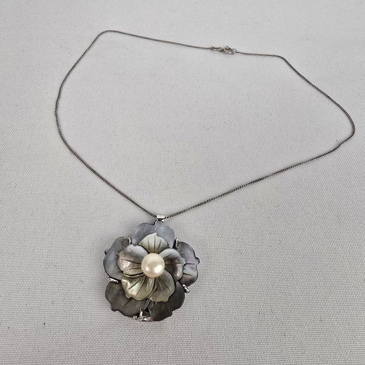 925 Sterling Chain Schell & Faux Pearl Flower Pendant Necklace