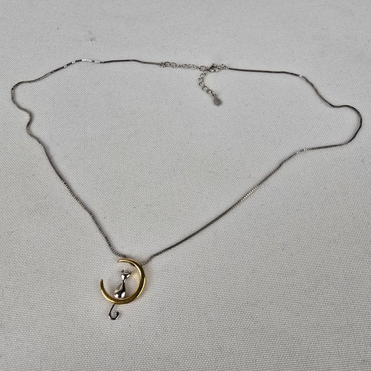 925 Sterling Silver Cat On The Moon Pendant Box Chain Necklace