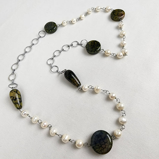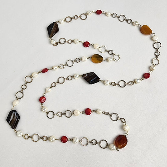 Natural Stone Faux Pearl Silver Link Long Necklace