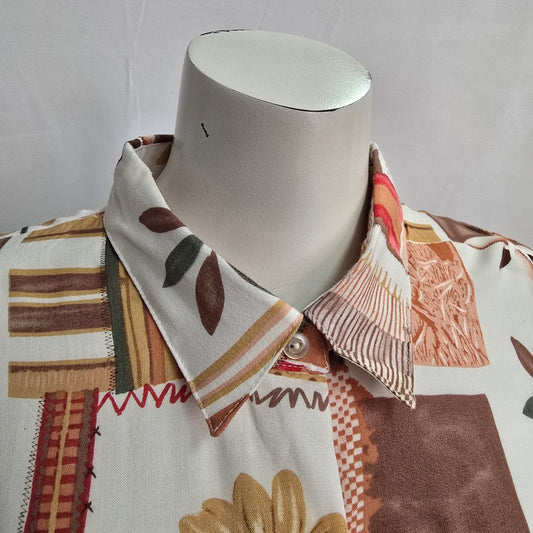 Vintage Black & Brown Tropical Print Button Up Collared Blouse Top Size L/XL