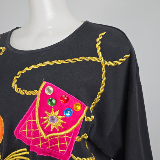 Vintage Valenti Gold Chain Embroidered Floral Purse Graphic Black T-shirt Size M/L