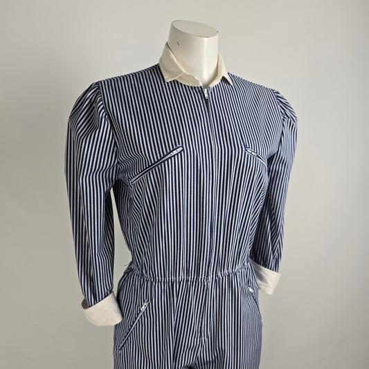Vintage Impromptu Grey Stripped Puff Sleeve Jumpsuit Size S/M