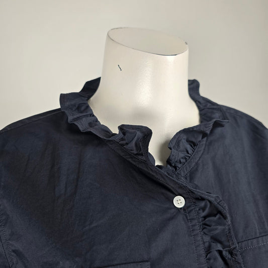 Talbots Petites Navy Blue Cotton Ruffle Detail Button Up Blouse Size 6p