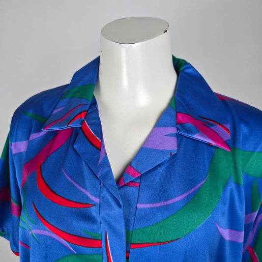 Vintage Blue Psychedelic Print Collared Short Sleeve Top Size L