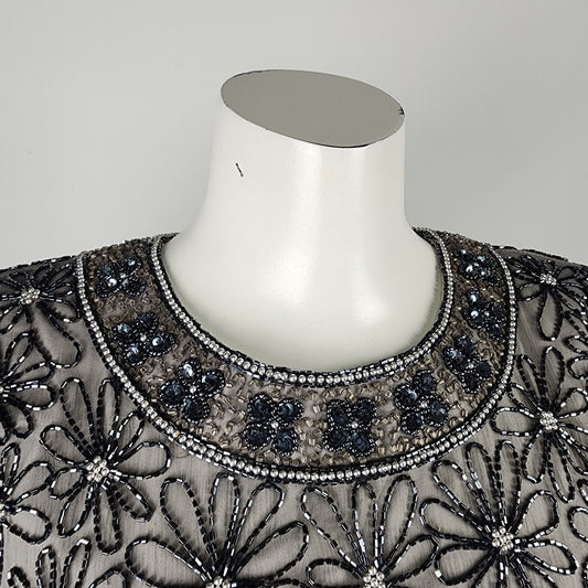 Vintage Papell Boutique Silk Silver Beaded Floral Blouse Size M