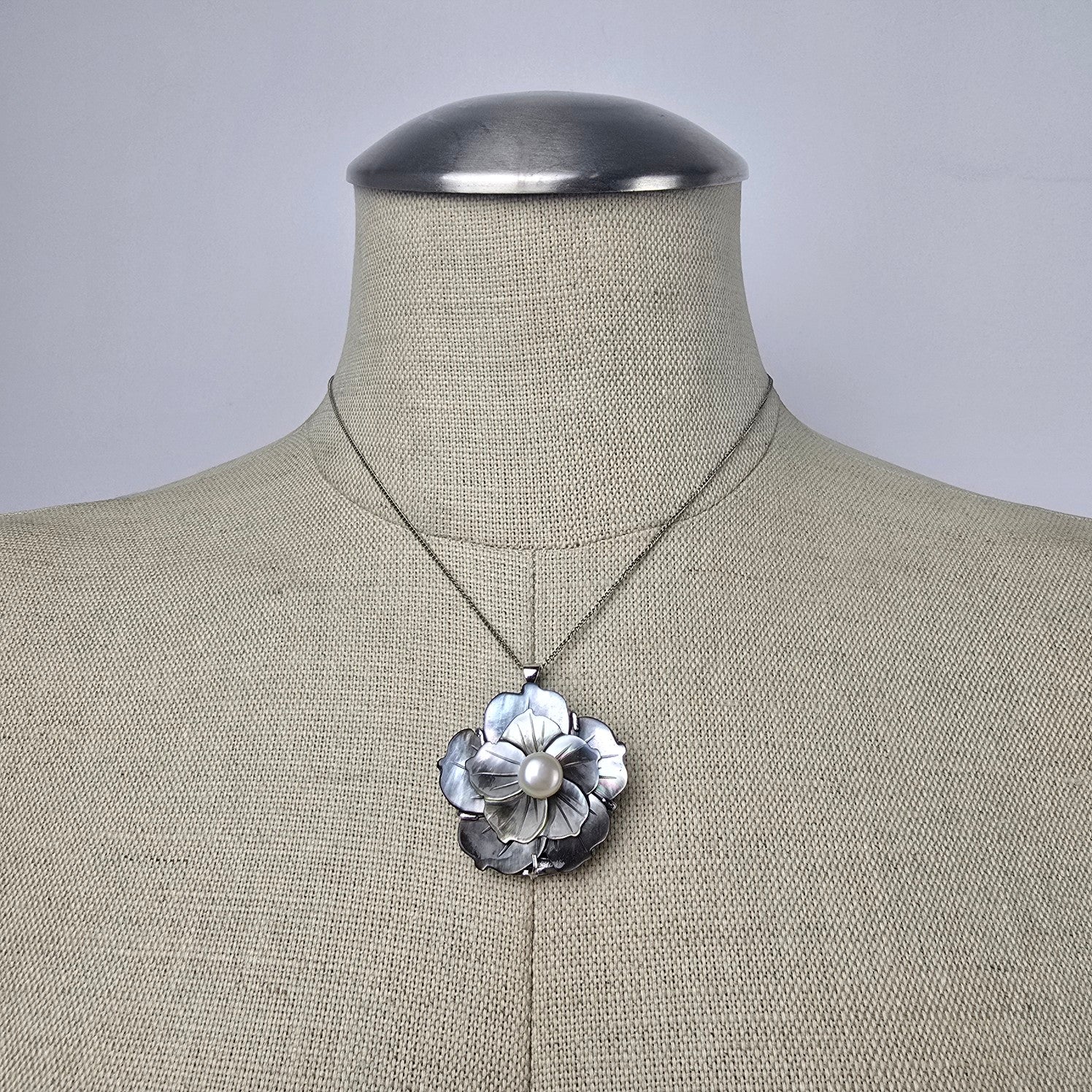 925 Sterling Chain Schell & Faux Pearl Flower Pendant Necklace