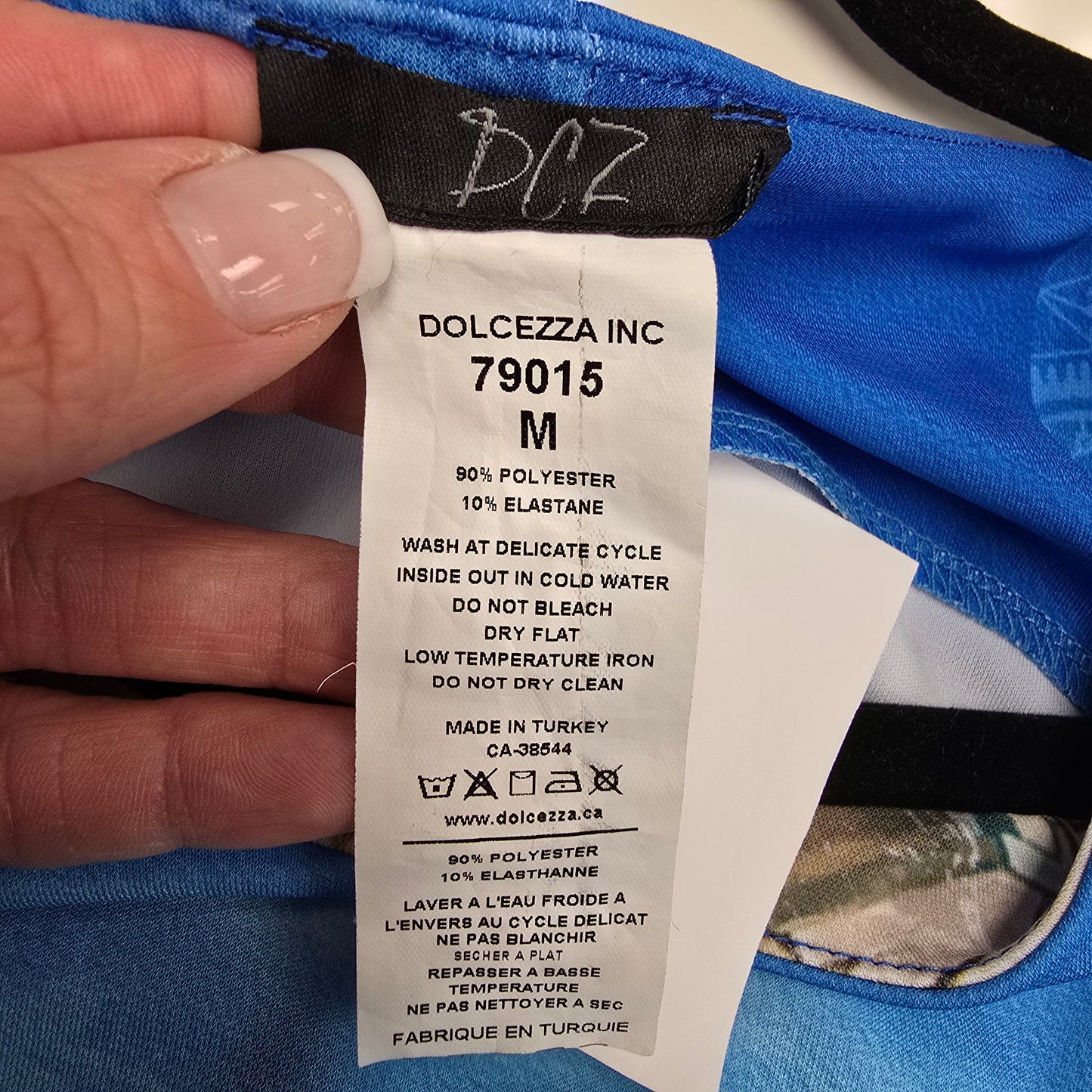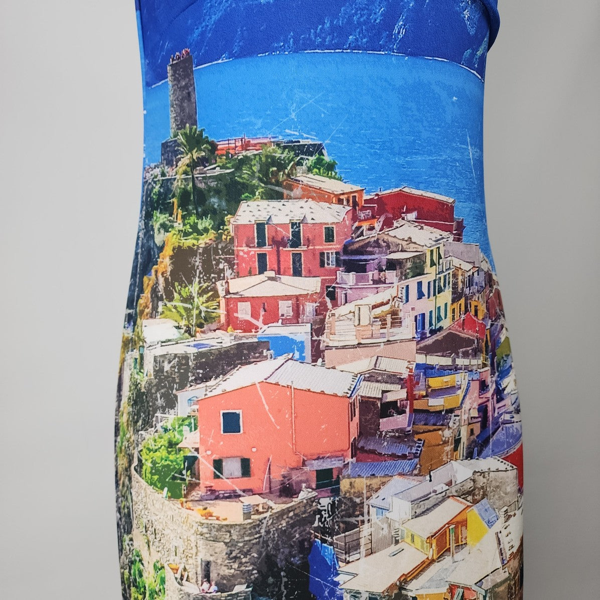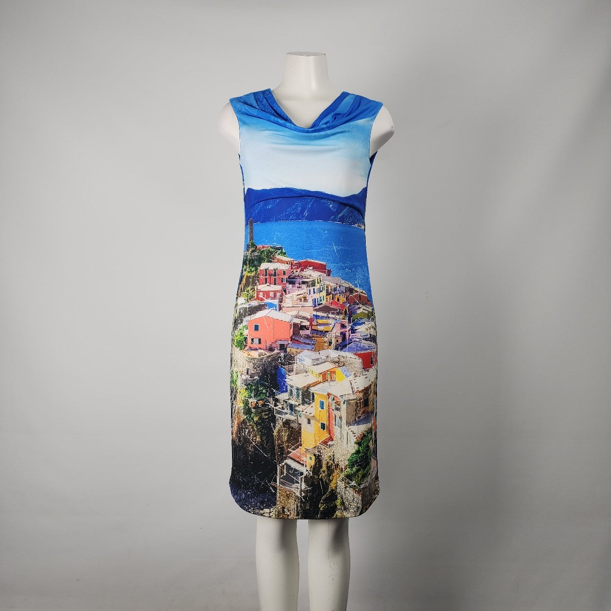 Art By Dolcezza Blue Tropical Town Scene Sheath Dress Size M