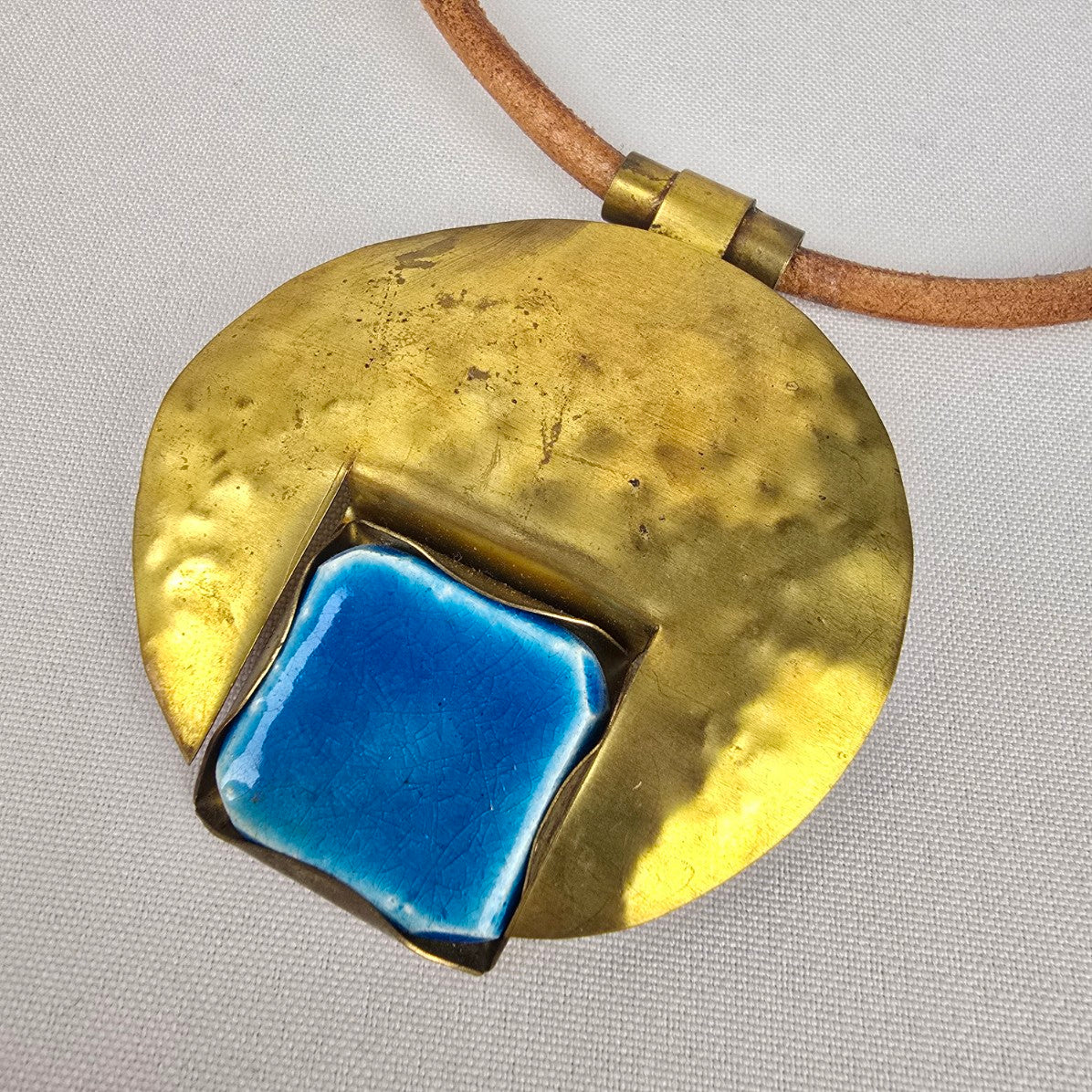 Gold & Blue Glass Statement Pendant Brown Cord Necklace