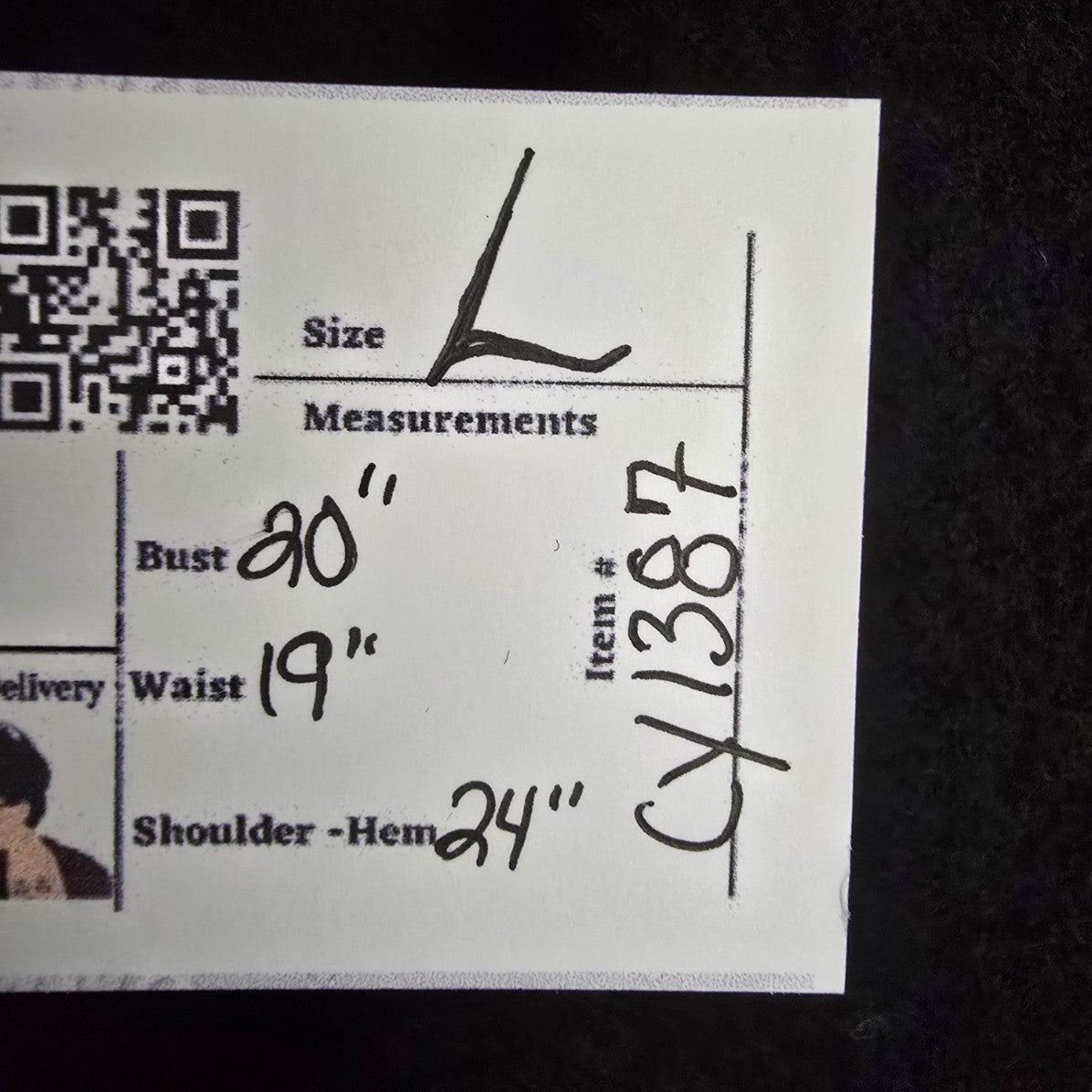 See last photos for fabric content and approximate FLAT measurements, compare our measurements to something in your closet to see if it will fit.