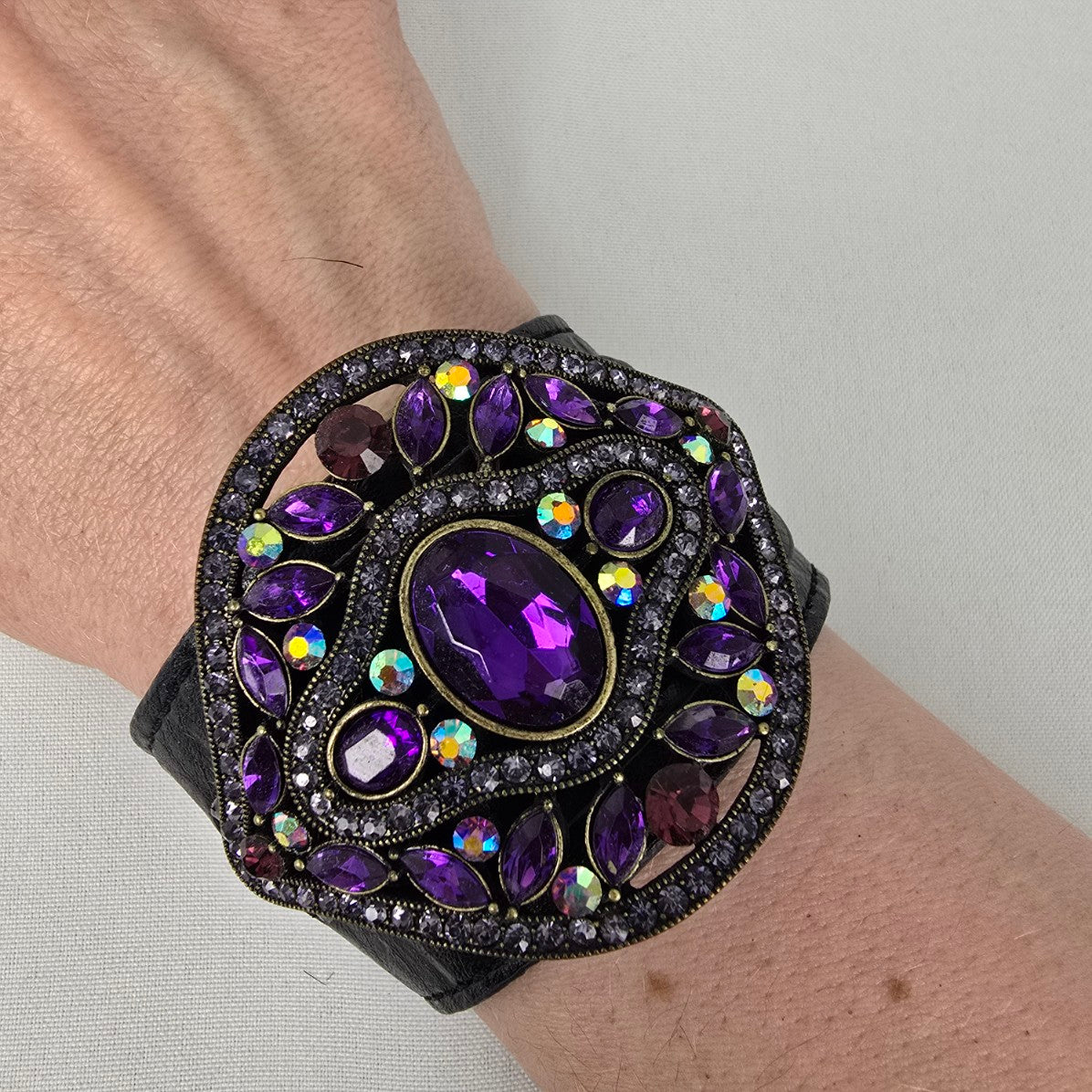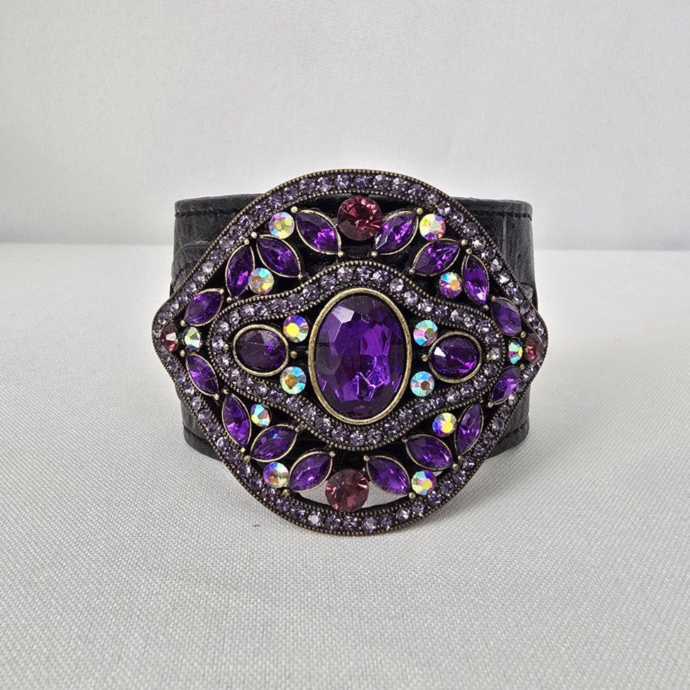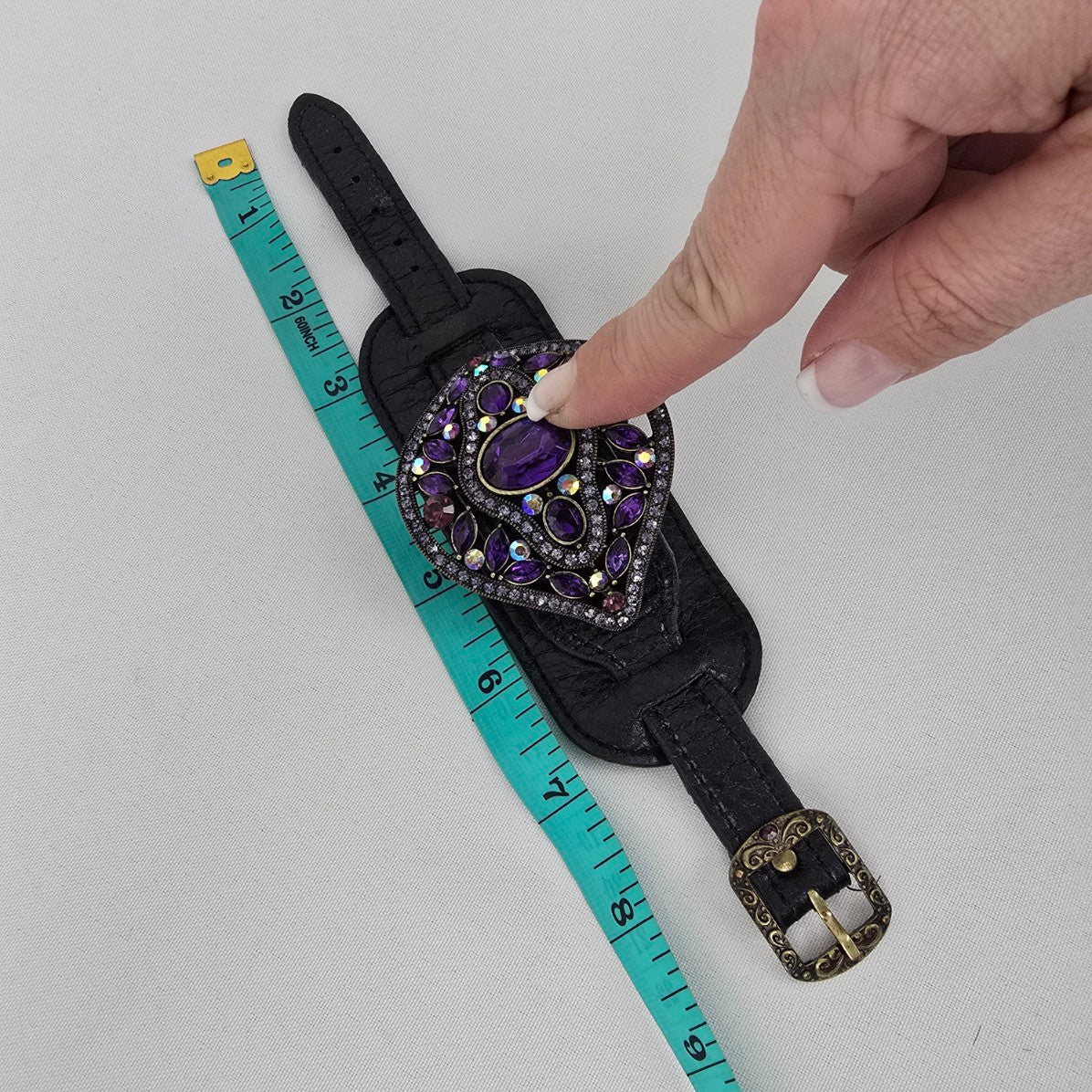 Purple Rhinestone Black Vegan Leather Cuff Bracelet