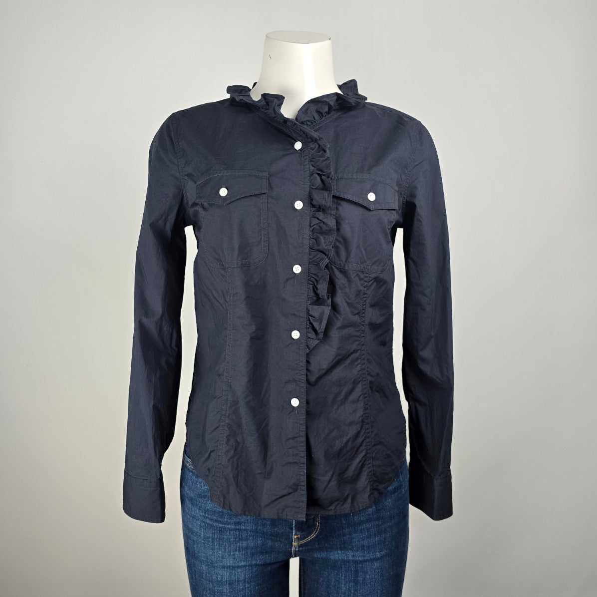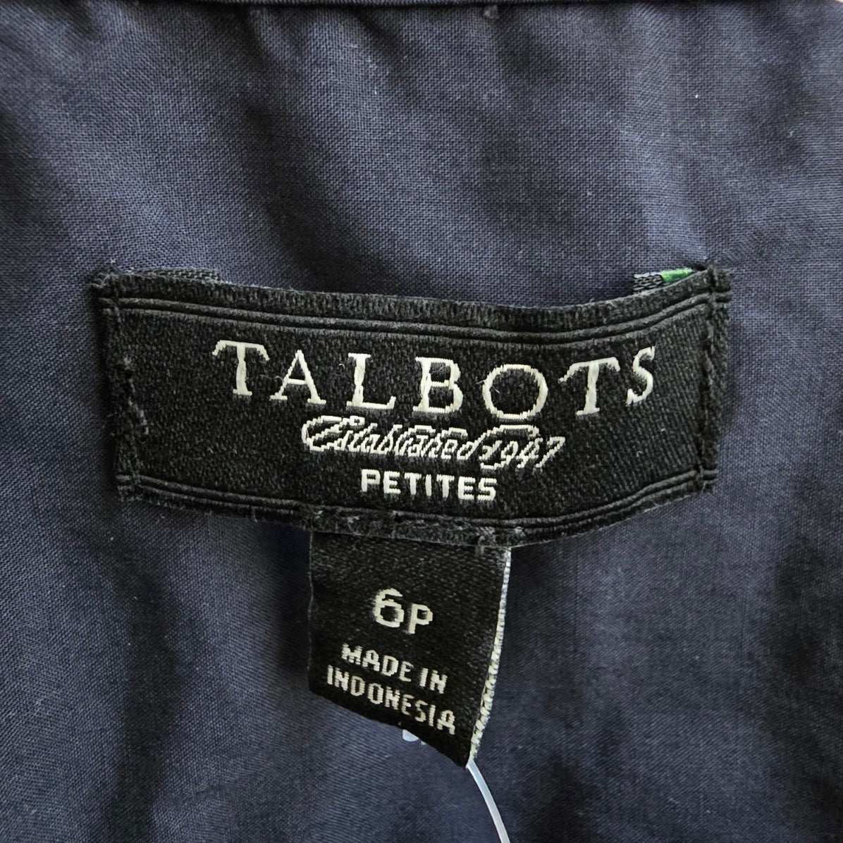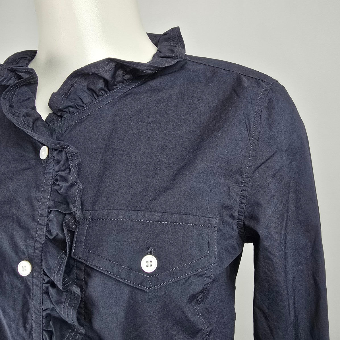 Talbots Petites Navy Blue Cotton Ruffle Detail Button Up Blouse Size 6p