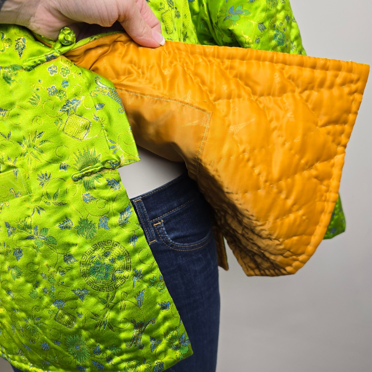 Vintage Chinese Style Quilted Bright Green Frog Closure Jacket Size L/XL