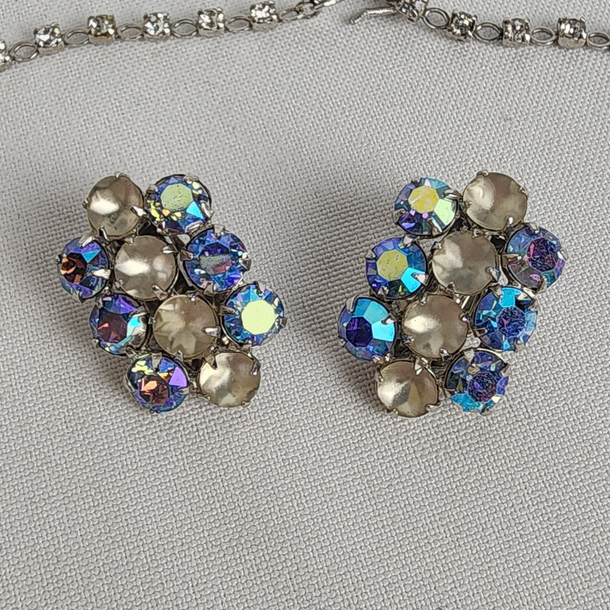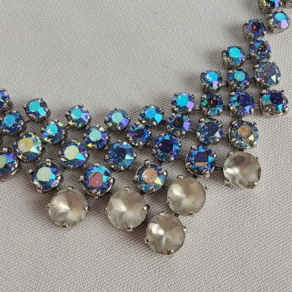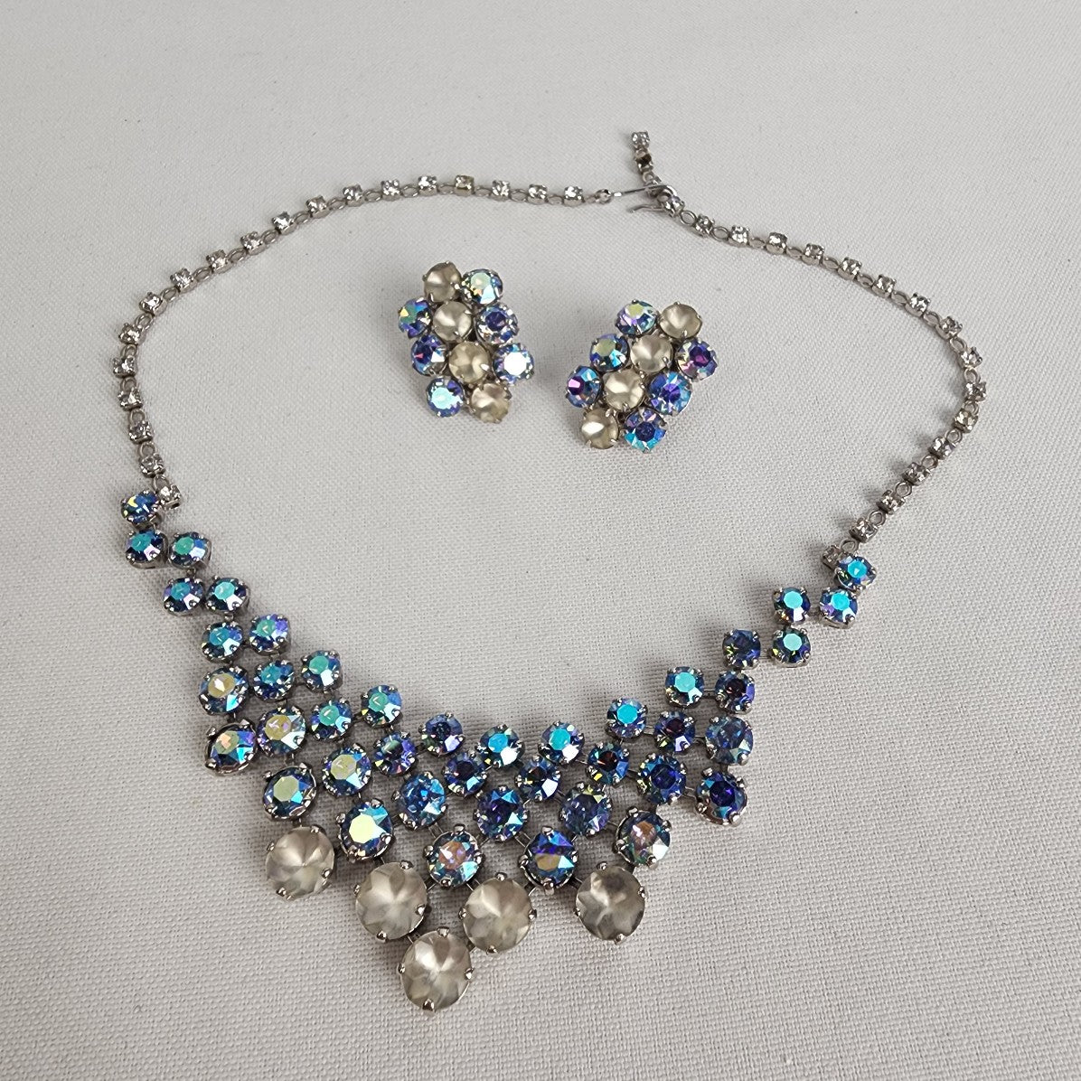 Add a touch of vintage glamour to your collection with this stunning crystal necklace and clip-on earring set. Featuring sparkling rhinestones in shades of blue, purple, and clear, this set is perfect for making a statement at any special occasion. The necklace showcases an elegant design with graduated rhinestone clusters, while the matching clip-on earrings complete the look with their dazzling brilliance. Ideal for vintage jewelry enthusiasts and anyone looking to add a unique, eye-catching piece to their wardrobe, this set is a must-have for any jewelry collection.