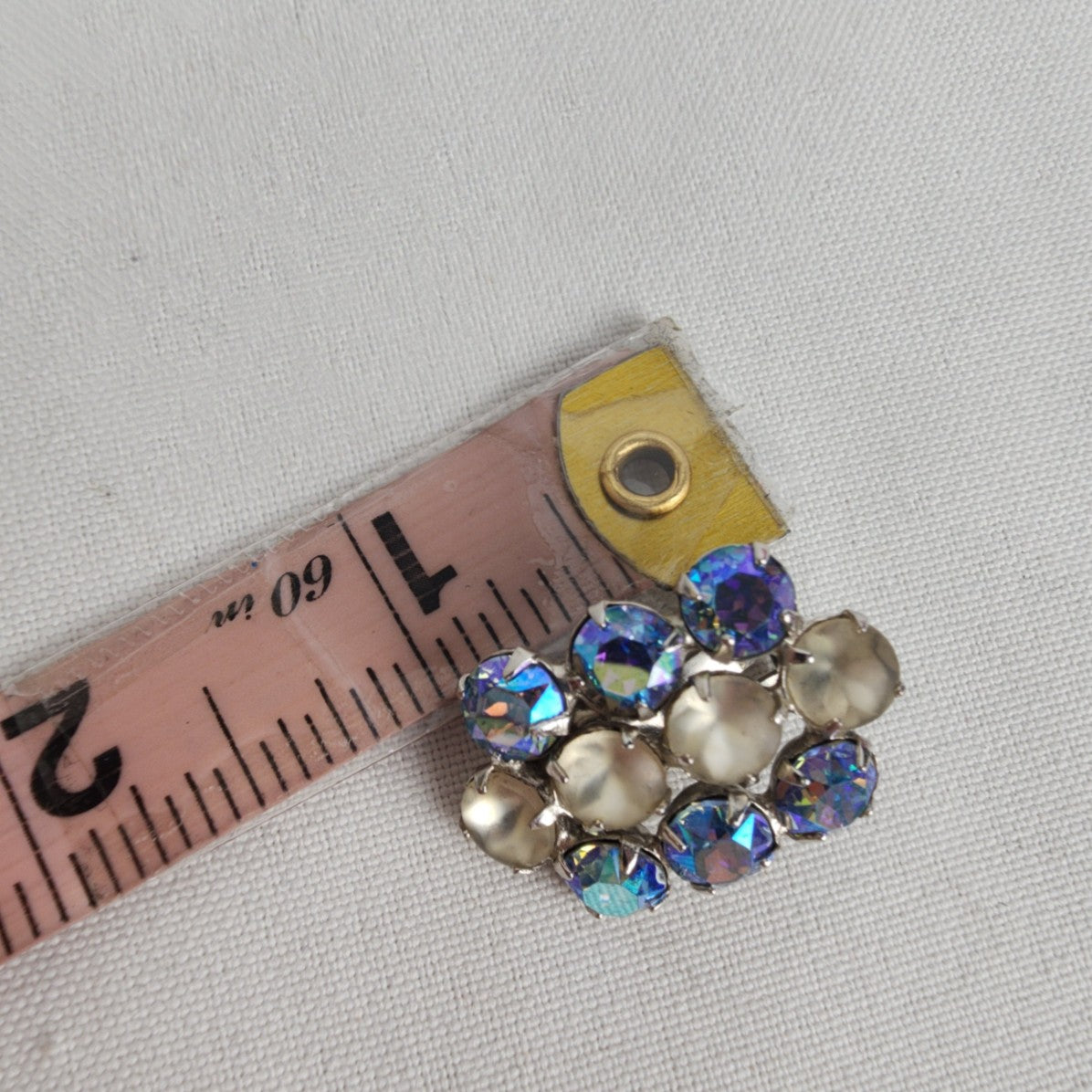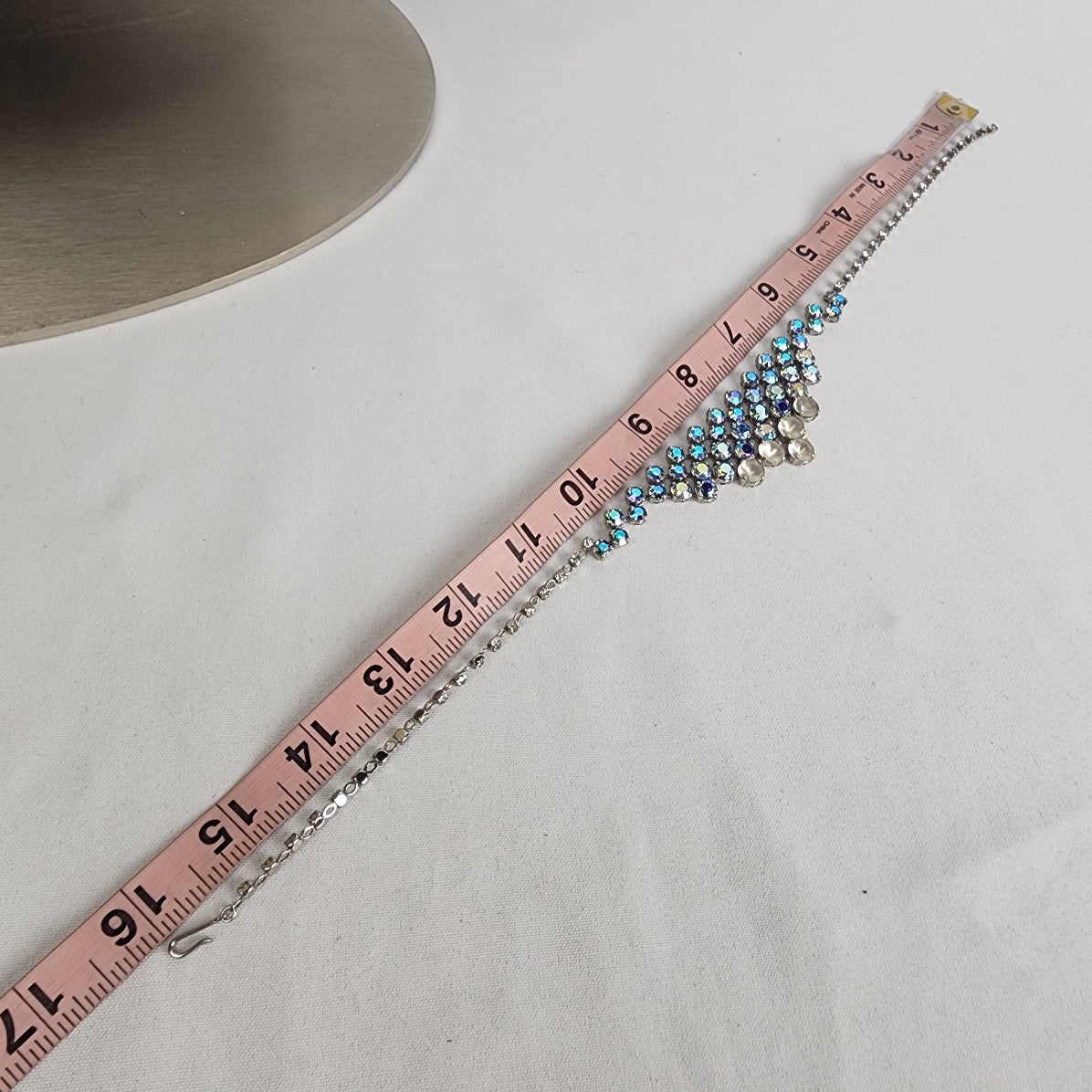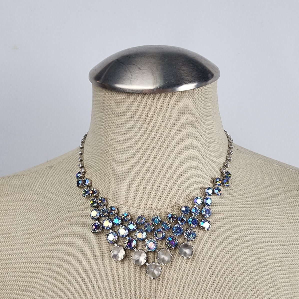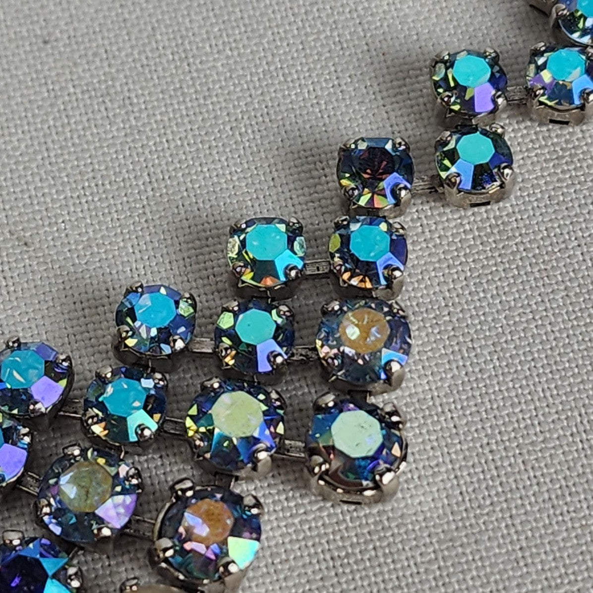 Add a touch of vintage glamour to your collection with this stunning crystal necklace and clip-on earring set. Featuring sparkling rhinestones in shades of blue, purple, and clear, this set is perfect for making a statement at any special occasion. The necklace showcases an elegant design with graduated rhinestone clusters, while the matching clip-on earrings complete the look with their dazzling brilliance. Ideal for vintage jewelry enthusiasts and anyone looking to add a unique, eye-catching piece to their wardrobe, this set is a must-have for any jewelry collection.