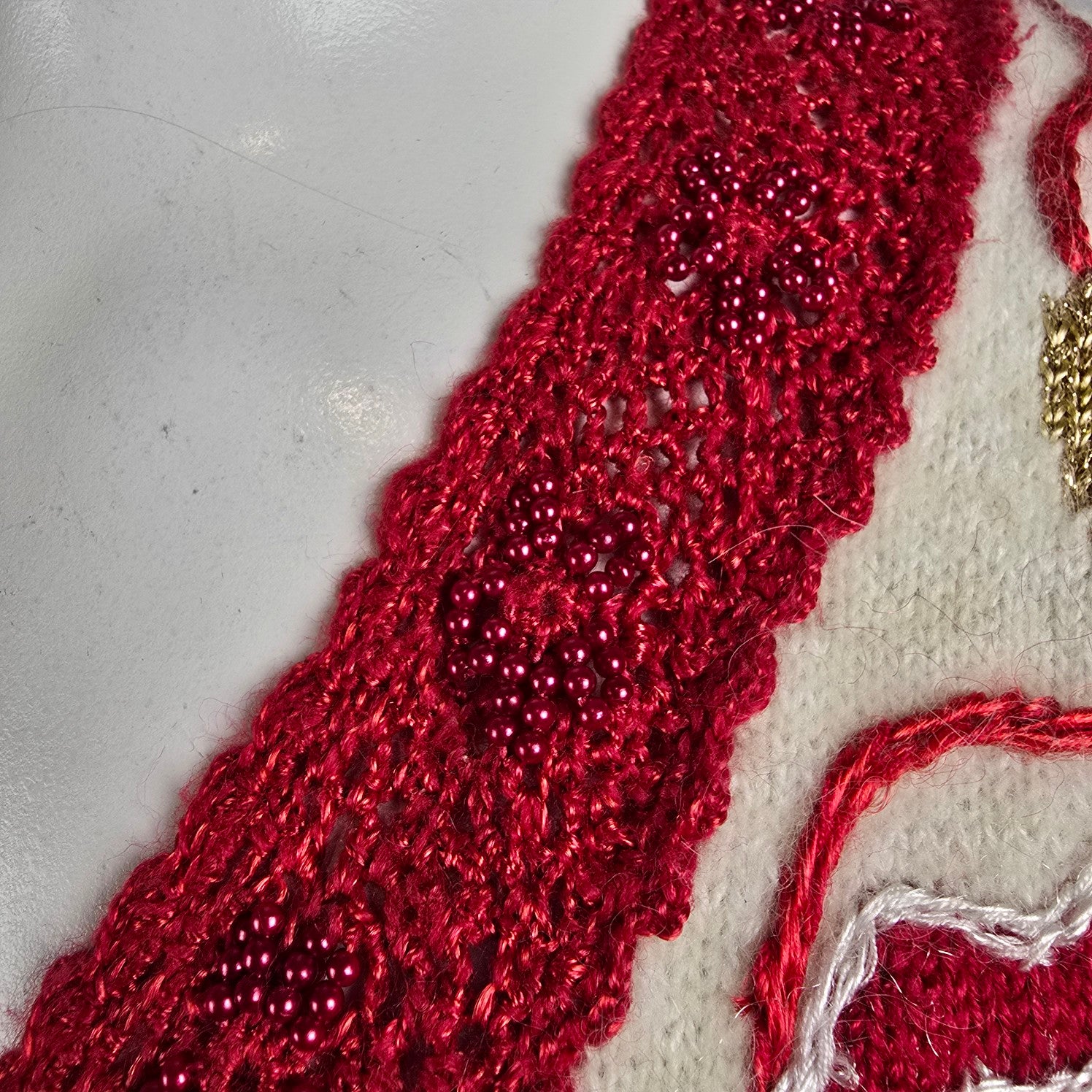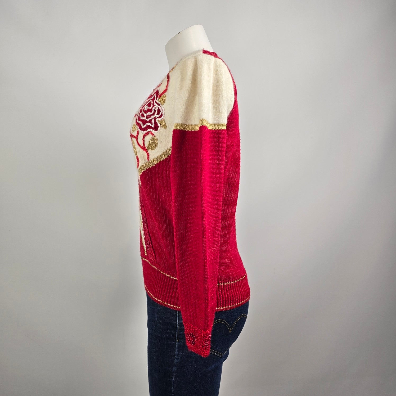 Vintage Jaclyn Smith Red Wool Knit Floral V Neck Sweater Size M