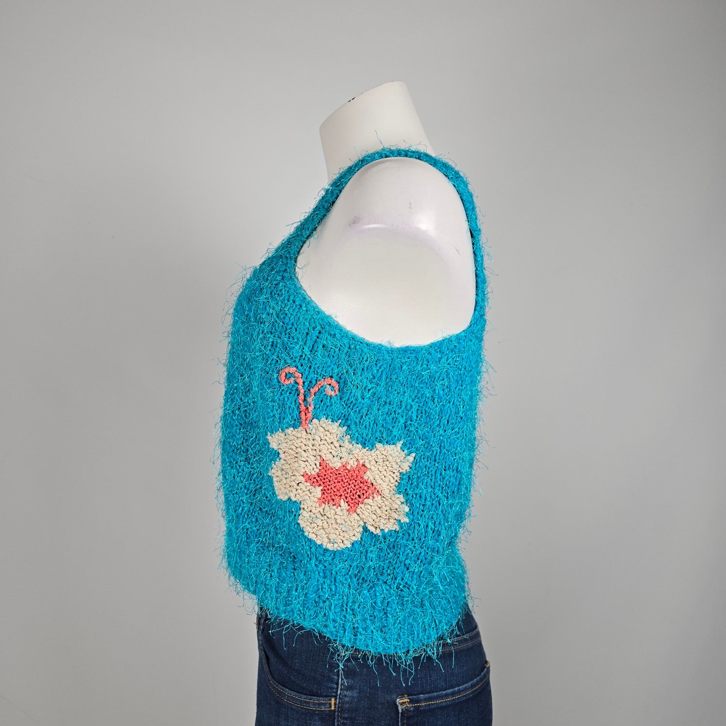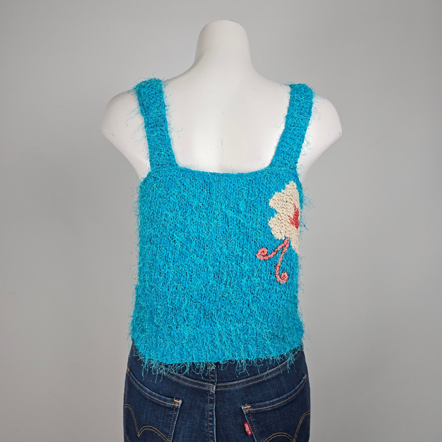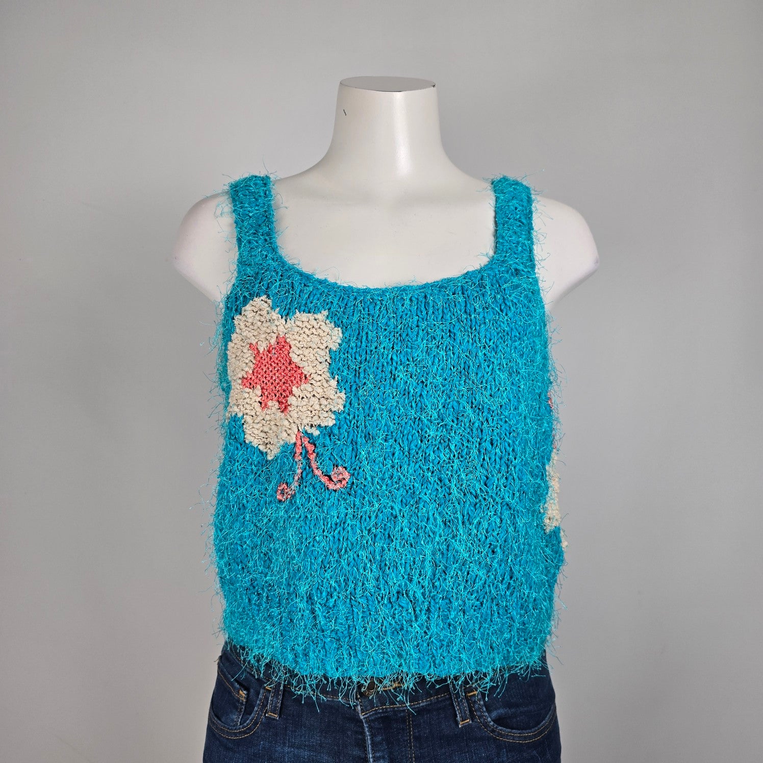 Vintage Mona's Handknit Teal Flower Knit Tank Top Size S