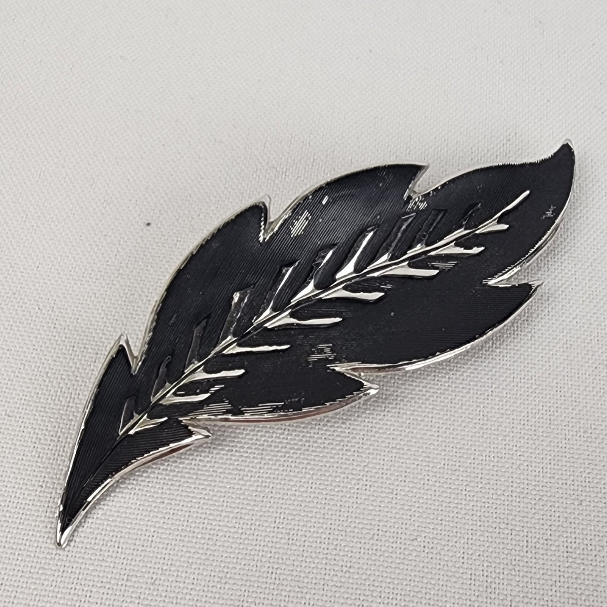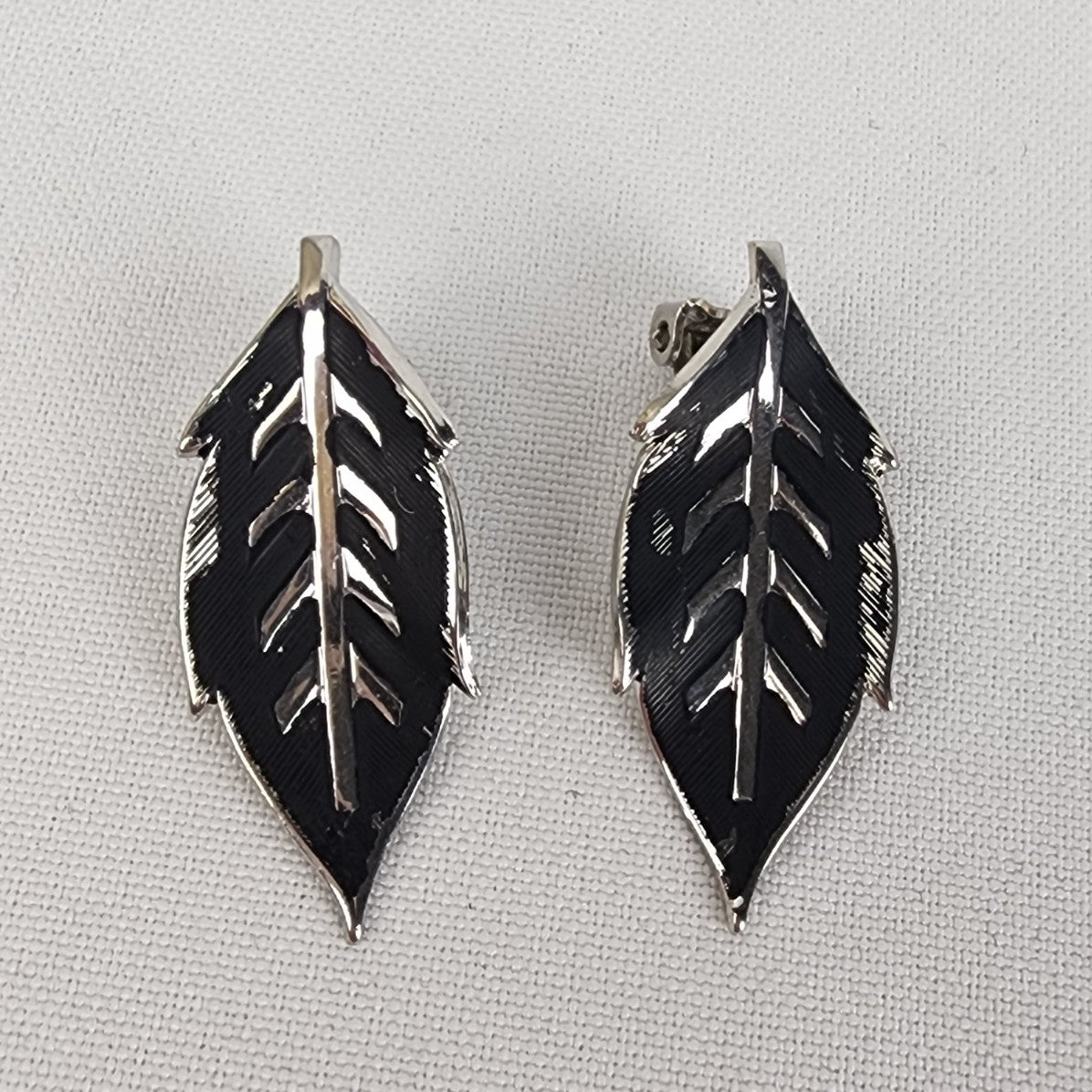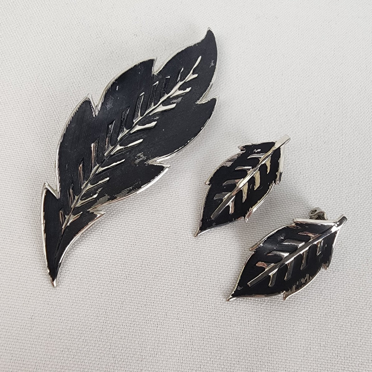 Vintage Painted Black Metal Leaf Brooch & Clip On Earrings