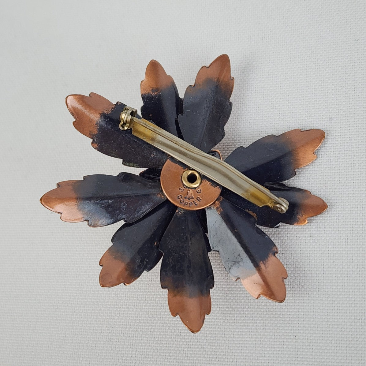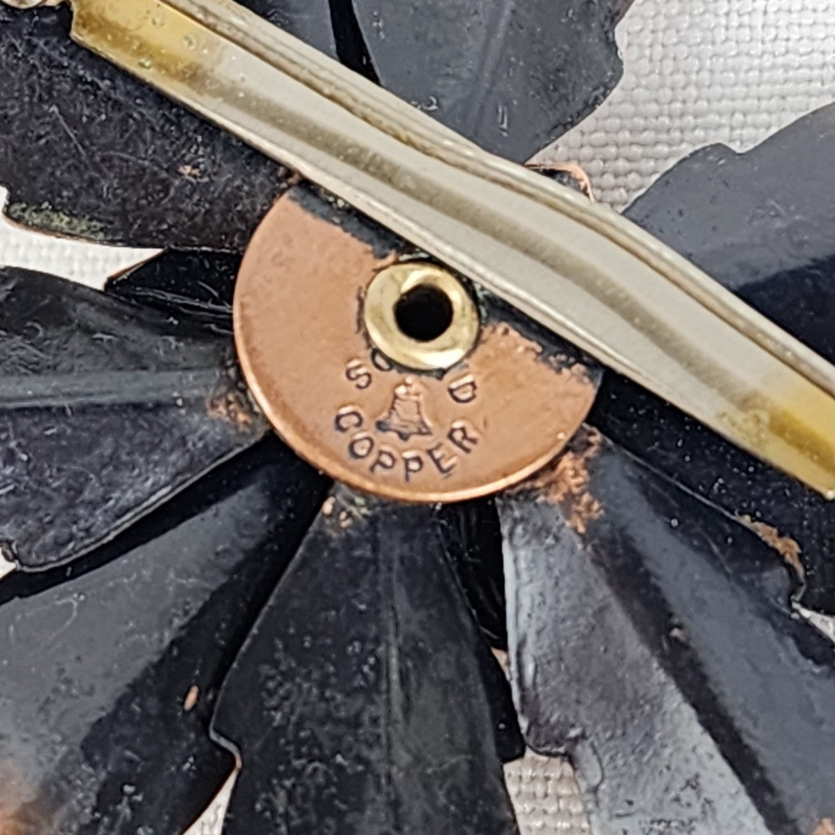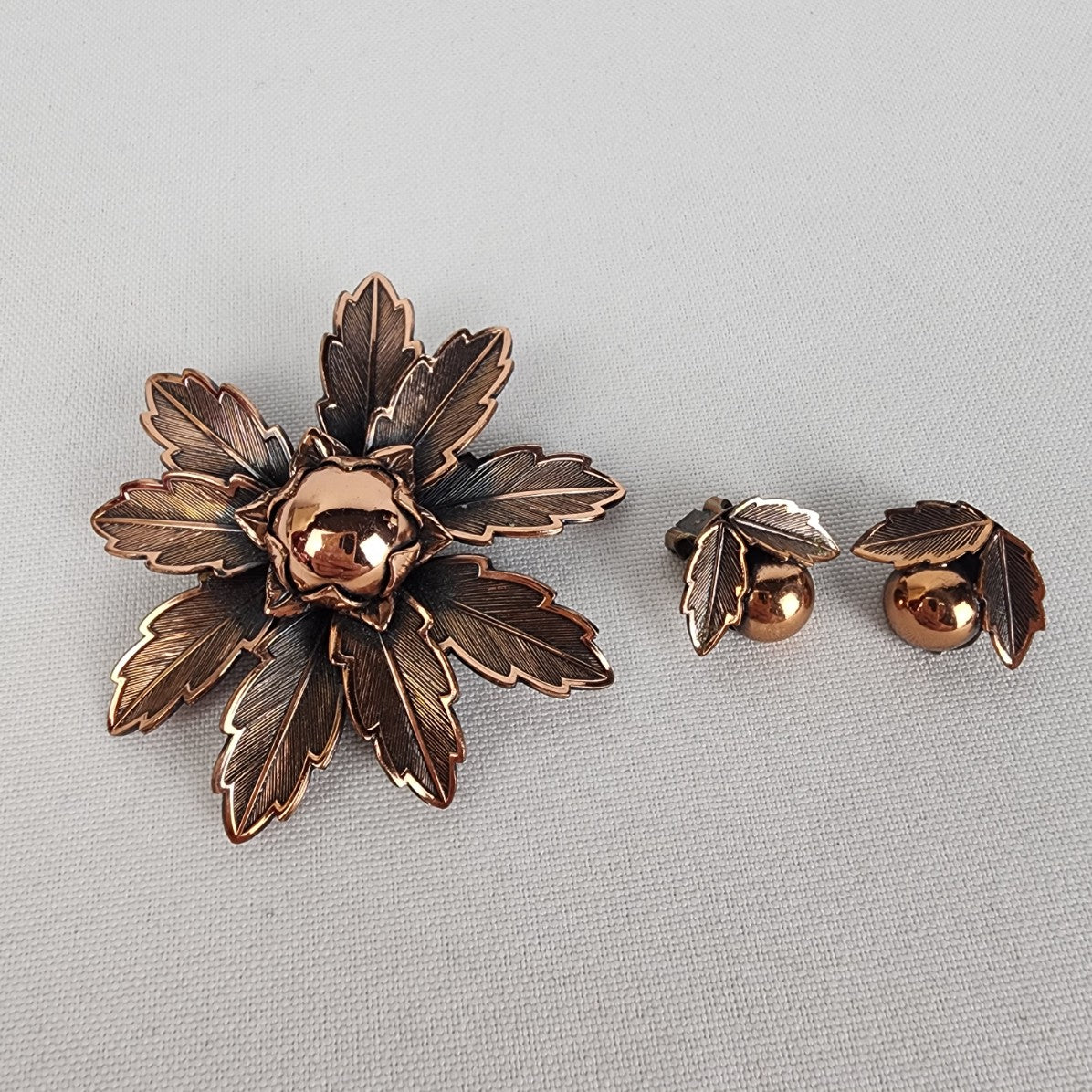 Vintage Solid Copper Flower Brooch & Clip On Earrings